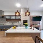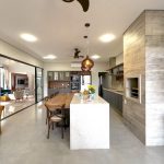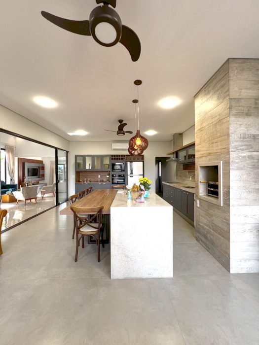 ➡️Espaço gourmet moderno com ilha e bancadas em mármore branco Paraná